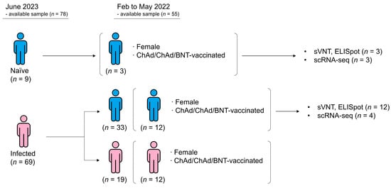 Schematic representation of subject definition and enrollment. The blue figure represents non-infected subjects, while the red figure represents infected subjects. Subjects who had not experienced SARS-CoV-2 infection are categorized as “Protected”, while subjects who had experienced at least one breakthrough infection until June 2023 are defined as “Infected.” The current study used this group definition and analyzed samples obtained from February to May 2022. Three patients in the Protected group underwent sVNT, ELISpot, and scRNA-seq, whereas 12 patients in the Infected group underwent all of the sVNT and ELISpot tests, but only four cases with sufficient sample volume underwent scRNA-seq. ChAd, ChAdOx1; BNT, BNT162b2; sVNT, surrogate virus neutralization test; ELISpot, enzyme-linked immunospot; scRNA-seq, single-cell RNA sequencing.