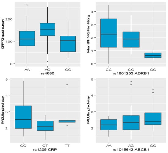 PACU length of stay was significantly affected by rs1205 CRP and ABCB1 rs1045642. The shorter stay of the CT group of the rs1205 SNP might be predictive of lower pain due to a subsequent lower inflammatory response, and, furthermore, a reduced need for observation and therapeutic interventions regarding pain in the PACU. In contrast, the GG genotype of ABCB1 may act as a predictor of higher needs in patients hospitalized in the PACU with regard to the need for effective postoperative pain control before discharge [,].