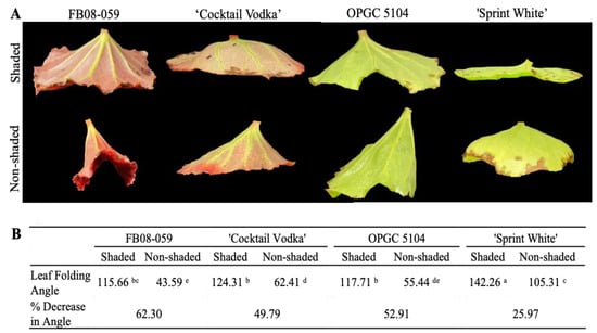 Leaf folding refers to the angle formed by three points: the leaf margin, the petiole-leaf blade junction, and the opposite leaf margin. All four genotypes exhibited leaf folding in response to the direct sunlight and elevated temperature conditions (non-shaded), but the degree of folding varied significantly among them (Figure 1A). A significant genotype–condition interaction effect was observed for leaf folding, indicating that the genotypes responded differently to the shaded vs. non-shaded conditions. Under non-shaded conditions or high-intensity light and elevated temperature, FB08-059 displayed the most pronounced leaf folding, with the leaf angle decreasing to 43.59°, representing a 62.30% change from the original angle (Figure 1A,B). Similarly, ‘Cocktail Vodka’ and OPGC 5104 also showed significant folding under non-shaded conditions, with leaf angle reductions of 49.79% (from 124.31° to 62.41°) and 52.91% (from 117.71° to 55.44°), respectively. In contrast, the ‘Sprint White’ genotype exhibited the least response to direct sunlight, with only a 25.97% reduction in leaf angle (from 142.56° under shaded conditions to 105.31° under non-shaded conditions).