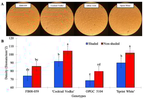Microscopic observations revealed significant differences in stomatal morphology and arrangement among the genotypes. All four genotypes displayed clustered stomata, a common morphological characteristic of semperflorens-type begonias, with cluster sizes ranging from one to seven stomata per cluster. Statistical analysis demonstrated significant differences in stomatal densities of new leaves between shaded and non-shaded conditions (p = 1.91 × 10−16) among the four genotypes (Figure 2). Under shaded conditions, FB08-059 and OPGC 5104 had significantly lower stomatal densities (74.10/mm2 and 68.47/mm2, respectively) compared to their commercial counterparts, ‘Cocktail Vodka’ (91.76/mm2) and ‘Sprint White’ (90.02/mm2; p = 5.77 × 10−13). This trend persisted under non-shaded conditions (p = 3.11 × 10−18), with FB08-059 and OPGC 5104 maintaining significantly lower stomatal densities (85.74/mm2 and 79.58/mm2, respectively) compared to ‘Cocktail Vodka’ (104.39/mm2) and ‘Sprint White’ (101.95/mm2). A two-way ANOVA revealed no significant interaction between light availability and genotype in determining stomatal density (p = 0.97), indicating that the increase in stomatal density from shaded to non-shaded conditions was consistent across all four genotypes. These results emphasize the uniformity of the stomatal density response to light availability despite genotype-specific differences in absolute stomatal density levels.