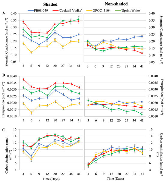 Stomatal conductance, an essential parameter of photosynthetic performance, exhibited significant variation among genotypes and conditions over the study period. Under shaded conditions, ‘Sprint White’ achieved the highest conductance rate (0.36 mol m−2 s−1), while OPGC 5104 displayed the lowest (0.12 mol m−2 s−1) (Figure 3A). Despite these differences, a consistent trend emerged across all genotypes in shaded conditions: stomatal conductance declined initially during the first 6–9 days, followed by gradual recovery. Commercial genotypes (‘Sprint White’ and ‘Cocktail Vodka’) consistently exhibited higher stomatal conductance rates under shaded conditions compared to the non-commercial genotypes (FB08-059 and OPGC 5104). In non-shaded conditions, FB08-059 maintained significantly higher stomatal conductance rates than ‘Cocktail Vodka’, OPGC 5104, and ‘Sprint White’ at all time points (Figure 3A). Remarkably, FB08-059 was the only genotype to achieve stomatal conductance levels in the non-shaded condition comparable to those in the shaded condition on day 41 (0.247 mol m−2 s−1 shaded; 0.234 mol m−2 s−1 non-shaded) (Figure 3A, Supplemental Figure S1A). A two-way ANOVA revealed a significant interaction between genotype and condition (p = 0.0006), underscoring the distinct physiological responses of the genotypes to the experimental conditions.