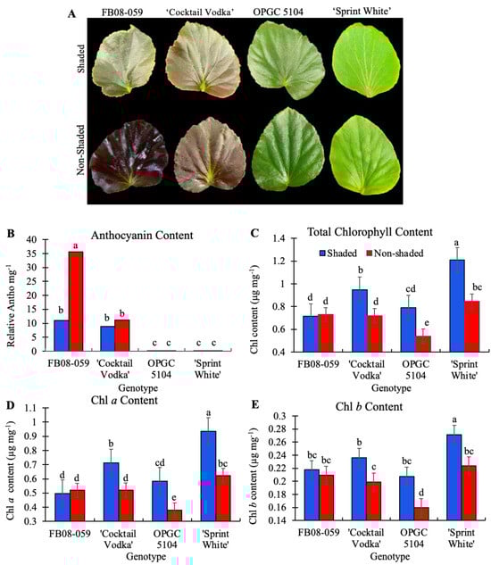 Anthocyanin and Chlorophyll Content in Wax Begonia Genotypes Under Shaded and Non-Shaded Conditions. (A) Representative leaf images from each genotype, taken 41 days after exposure to shaded and non-shaded conditions. (B) Relative anthocyanin content of four genotypes under shaded and non-shaded conditions. ‘OPGC5104’ and ‘Sprint White’ bars appear minimal due to their negligible anthocyanin levels (<0.1 absorbance units) but are shown to highlight differences. (C) Total chlorophyll content (Chl a + Chl b) in four genotypes under shaded and non-shaded conditions. (D) Chlorophyll a content. (E) Chlorophyll b content. Bars represent mean ± standard error (n = 12). Different letters above bars indicate significant differences according to Tukey’s HSD test (p-value ≤ 0.05).