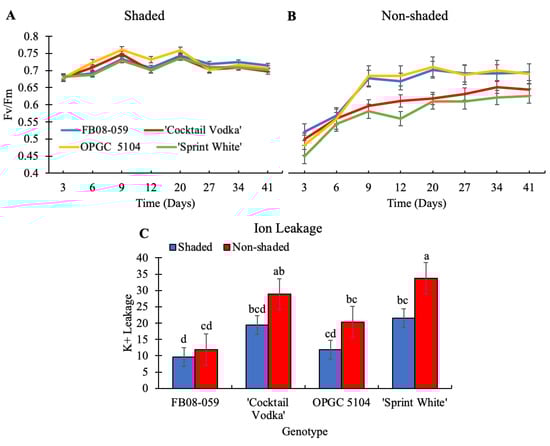 Effects of Shaded and Non-Shaded Conditions on Fluorescence and Electrolyte Leakage in Wax Begonia Genotypes. (A) Temporal dynamics of Fv/Fm under shaded conditions across four genotypes. (B) Temporal dynamics of Fv/Fm under non-shaded conditions. (C) Electrolyte leakage, expressed as the percentage of total ions released. Bars represent mean ± standard error (n = 12). Letters above bars indicate significant differences among all genotypes and conditions based on Tukey’s HSD test (p-value ≤ 0.05).