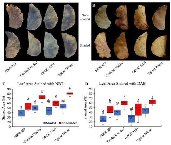 Oxidative Stress Responses in Wax Begonia Genotypes Under Shaded and Non-Shaded Conditions (A) NBT staining for superoxide (O2·−) accumulation in leaf tissue of four genotypes under shaded and non-shaded conditions. (B) DAB staining for hydrogen peroxide (H2O2) accumulation in leaf tissue under both conditions. (C) Quantification of O2·− accumulation. (D) Quantification of H2O2 accumulation. Bars represent mean ± standard error (n = 12). Different letters indicate significant differences among genotypes as determined by Tukey’s HSD test (p-value ≤ 0.05).