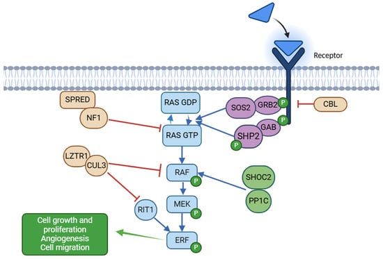- Tartaglia, M.; Aoki, Y.; Gelb, B.D. The molecular genetics of RASopathies: An update on novel disease genes and new disorders. Am. J. Med. Genet. Part C Semin. Med. Genet. 2022, 190C, 425–439. [Google Scholar] [CrossRef]