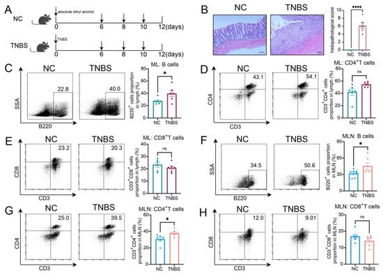The ratio of B cells increased in MLs and MLNs in TNBS-induced colitis rats. (A) Model of TNBS-induced acute colitis in rats. (B) H&E staining images from NC and TNBS rats are presented on the left, with quantitative analysis provided on the right. Representative flow cytometry images and statistical analysis of B cells (C), CD4+ T cells (D), and CD3+CD8+ T cells (E) in the MLs of two groups. Representative flow cytometry images and statistical analysis of B cells (F), CD4+ T cells (G), and CD3+CD8+ T cells (H) in the MLNs of two groups. NC—normal control rats; TNBS—TNBS-induced colitis rats; MLs—mesenteric lymphatics; MLNs—mesenteric lymph nodes. N = 6. * p < 0.05; **** p < 0.0001 with NC rats; n.s.—no significant difference.