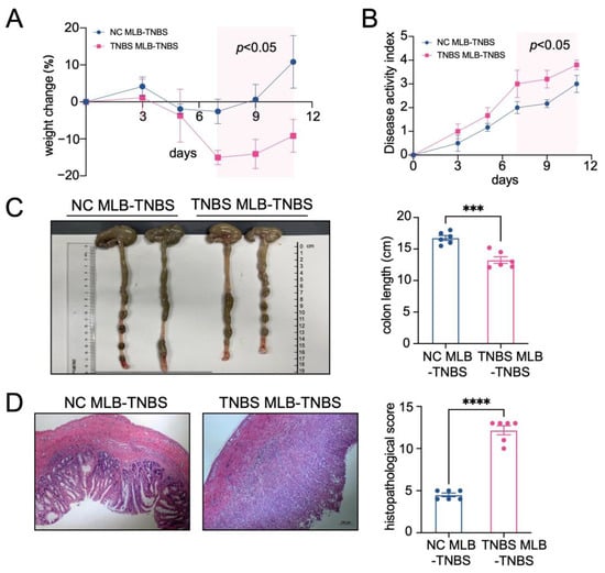The adoptive transfer of TNBS-induced MLB cells aggravated colitis. A weight change (A) and disease activity index (B) comparison between the NC MLB-TNBS group and the TNBS MLB-TNBS group. The shaded area indicates the time period during which a statistically significant difference (p < 0.05) was observed between the two groups (C,D) Representative colon-length and intestinal pathological images are shown on the left, with statistical analysis shown on the right. NC MLB-TNBS—TNBS-induced colitis rats receiving NC MLB cells; TNBS MLB-TNBS—TNBS-induced colitis rats receiving TNBS MLB cells. N = 6. *** p < 0.001; **** p < 0.0001.