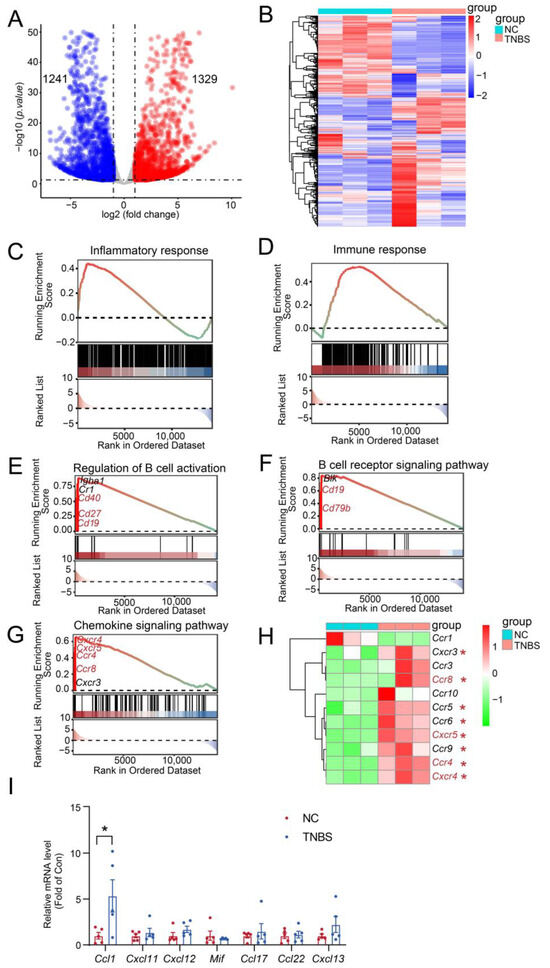 Inflammatory and immune responses were activated in MLB cells with colitis. The volcano plot analysis (A) and heatmap (B) visualize the transcriptional differences between MLB cells from the NC and TNBS groups. In the volcano plot, red dots represent significantly upregulated transcripts, and blue dots represent significantly downregulated transcripts. Dashed lines indicate the thresholds for differential expression: log2(fold change) > 1 or < –1 (vertical) and adjusted p-value < 0.05 (horizontal). Pathway enrichment highlights core genes upregulated in B cell-driven inflammatory responses (C), B cell-mediated immune response (D), the regulation of B cell activation (E), the B cell receptor signaling pathway (F), and the B cell chemokine signaling pathway (G) between the MLB cells of NC and TNBS. The red-to-green color gradient indicates the ranking of genes from high to low expression. The horizontal dotted line in the upper panel represents the zero enrichment score, and the dotted line in the lower panel indicates the baseline of the ranking metric. (H) The heatmap displays the different chemokine-related genes between the MLB cells of NC and TNBS. (I) Comparison of the mRNA expression of Ccl1 (ligand of Ccr8), Mif, Cxcl12, and Cxcl11 (ligands of Cxcr4), Ccl17 and Ccl22 (ligands of Ccr4), and Cxcl13 (ligand of Cxcr5) in colonic tissues between NC and TNBS rats. MLB—mesenteric lymphatic B cells; NC—normal control rats; TNBS—TNBS-induced colitis rats. Red asterisk represents upregulated transcripts. N = 3–5. * p < 0.05.