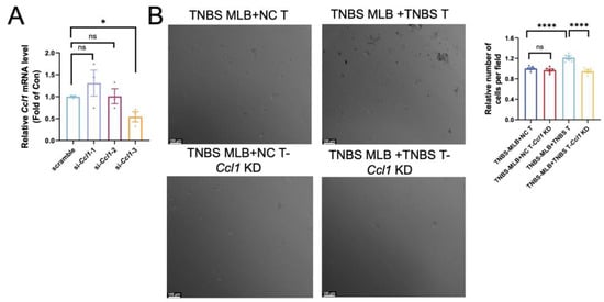 Effect of Ccl1 silencing in colonic CD4+ T cells on migratory behavior of MLB cells. (A) Relative Ccl1 mRNA expression after si-Ccl1-1, -2, or -3 treatment was assessed, with p-values of 0.3566, 0.9593, and 0.0174, respectively. (B) Representative images of cells in the lower chamber are shown for the TNBS MLB+NC T group, TNBS MLB+NC T-Ccl1 KD group, TNBS MLB+TNBS T group, and TNBS MLB+TNBS T-Ccl1 KD group in the left panel, and statistical analysis for the four groups is displayed in the right panel. TNBS MLB+NC T—co-culture of mesenteric lymphatic B cells from TNBS rats with colonic CD4+ T cells from NC rats; TNBS MLB+NC T-Ccl1 KD—co-culture of mesenteric lymphatic B cells from TNBS rats with Ccl1-knockdown colonic CD4+ T cells from NC rats; TNBS MLB+TNBS T—co-culture of mesenteric lymphatic B cells from TNBS rats with colonic CD4+ T cells from TNBS-induced colitis rats; TNBS MLB+TNBS T-Ccl1 KD—co-culture of mesenteric lymphatic B cells from TNBS rats with Ccl1-knockdown colonic CD4+ T cells from TNBS-induced colitis rats. N = 3–6. * p < 0.05; **** p < 0.0001; n.s.—no significant difference.