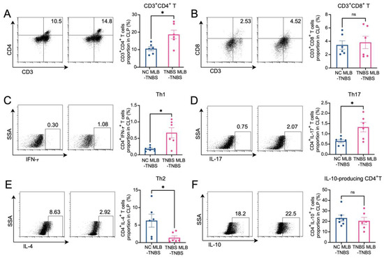 Alterations in T cells in colonic lamina propria. The figures show the ratio of CD3+CD4+ T cells (A), CD3+CD8+T cells (B), CD4+IFN-γ+ T cells (Th1) (C), CD4+IL-17+ T cells (Th17) (D), CD4+IL-4+ T cells (Th2) (E), and IL-10-producing CD4+ cells (F) in the colonic lamina propria of the NC MLB-TNBS and TNBS MLB-TNBS groups. NC MLB-TNBS—TNBS-induced colitis rats administered MLB cells from NC rats; TNBS MLB-TNBS—TNBS-induced colitis rats administered MLB cells from TNBS rats. N = 6. * p < 0.05; n.s.—no significant difference.