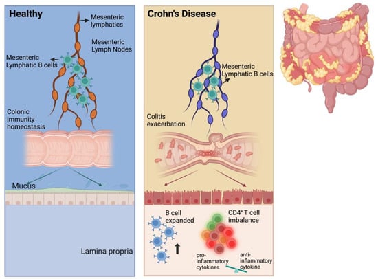 - Kappel-Latif, S.; Kotagiri, P.; Schlager, L.; Schuld, G.; Walterskirchen, N.; Schimek, V.; Sewell, G.; Binder, C.; Jobst, J.; Murthy, S.; et al. Altered B-Cell Expansion and Maturation in Draining Mesenteric Lymph Nodes of Inflamed Gut in Crohn’s Disease. Cell Mol. Gastroenterol. Hepatol. 2024, 17, 662–666. [Google Scholar] [CrossRef] [PubMed]