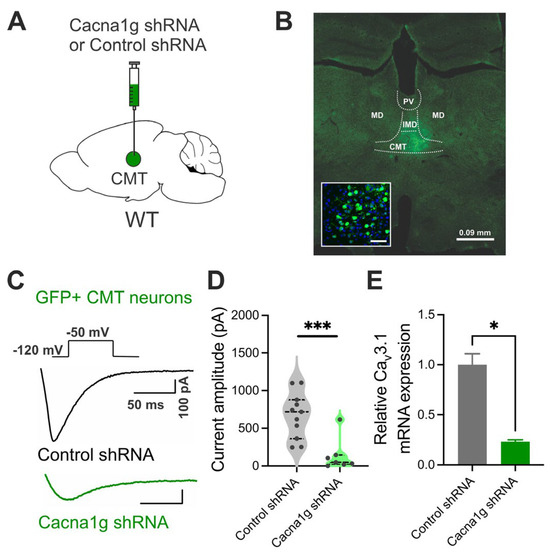 The use of global CaV3.1 knock-out (KO) mice is useful for proof-of-principle confirmation, but the widespread distribution of these channels and possible compensatory modulations is a major disadvantage of this approach. To specifically investigate the contribution of CaV3.1 T-channels in the thalamus, we used mice with CMT-specific silencing of the Cacna1g gene, which encodes the CaV3.1 channel. Our method consisted of knocking down Cacna1g by injecting short hairpin RNA (shRNA) using a procedure described elsewhere [38,44]. Adult male C57BL/6J mice were anesthetized with 1–2% isoflurane, given 2.5 L/min of oxygen, and transferred to a standard stereotaxic frame (Kopf Instruments, CA, USA). The mice were randomized into two treatment groups: scrambled control (AAV2-GFP-U6-scrmb-shRNA; titer: 1.1 × 1013 GC/mL; Vector Biolabs, Malvern, PA) or Cacna1g shRNA targeting CaV3.1 (AAV2-GFP-U6-mCACNA1G-shRNA; titer: 6.8 × 1012 GC/mL; Vector Biolabs) groups. The shRNAs were injected into the CMT [anteroposterior (AP): −1.35 mm; mediolateral (MD): 0; and dorsoventral (DV): −3.6 mm] using high-titer AAV2 (0.5 μL, using a 5 μL Hamilton syringe at a rate of 0.1 µL/min). The animals were allowed to recover for at least three weeks before the experiments (behavioral or ex vivo brain slice recordings) were performed to ensure adequate virus expression. Although we aimed to target just CMT neurons in our experiments, we are aware that other parts of the thalamus could have been partially transfected (mostly the IMD, PV, and MD; Figure 1B). We excluded all animals that did not have the highest Cacna1g shRNA or scrambled shRNA expression in GFP-positive neurons in the CMT in comparison to other areas. The WT animals were randomly assigned to the different groups such that animals from the same litter were used for the generation of both control and CaV3.1 KD animals. Animals from at least 3 different litters were used for the experiments.