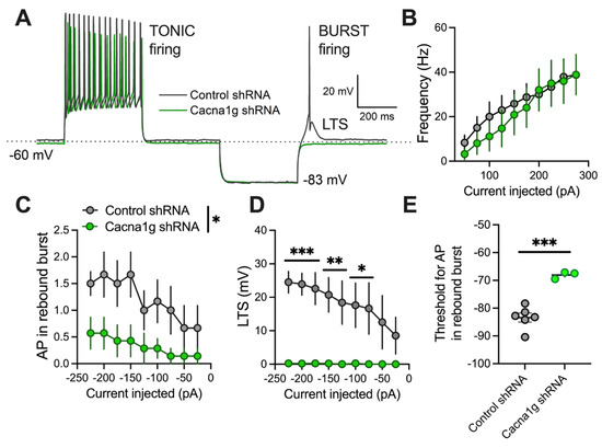 Different firing properties of GFP-positive thalamic neurons from control (scrambled shRNA) and Cacna1g shRNA-injected animals. (A) Original traces from representative thalamic neurons from GFP-positive control (black) and Cacna1g shRNA-transfected (green) neurons showing active membrane responses to depolarizing (275 pA) and hyperpolarizing (−225 pA) current injections. Note that GFP-positive neurons from Cacna1g shRNA cohort did not show action potentials (APs) with low threshold spikes (LTSs) after membrane hyperpolarization. (B) There was no difference in average tonic AP firing frequency (50–275 pA current injections) between GFP-positive thalamic neurons from control and Cacna1g shRNA mice. (C) Number of APs in rebound burst was statistically significantly smaller in GFP-positive neurons from Cacna1g shRNA animals (two-way RM ANOVA: interaction F(8,88) = 0.963, p = 0.470; injected current F(8,88) = 4.92, p < 0.001; GFP F(1,11) = 5.133, p = 0.045). (D) LTSs were not observed in thalamic GFP-positive Cacna1g shRNA-transfected neurons (two-way RM ANOVA: interaction F(8,88) = 3.50, p = 0.001; injected current F(8,88) = 3.748, p < 0.001; GFP F(1,11) = 15.02, p = 0.003; Sidak’s post hoc test). (E) Threshold for rebound burst firing was higher in thalamic neurons from Cacna1g shRNA-injected animals (unpaired two-tailed t-test: t(7) = 6.314, p < 0.001). Note that this rebound firing had APs without expected T-channel-dependent LTSs. n = 6 control and 7 Cacna1g shRNA-transfected GFP-positive neurons; * p < 0.05, ** p < 0.01, *** p < 0.001.