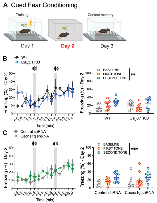 In order to investigate the role of CaV3.1 T-channels in fear memory processing, we first performed cued and contextual fear conditioning (CFC) experiments on control (WT) and global CaV3.1 KO animals (Figure 1). A schematic of our fear-conditioning protocol is shown in Figure 1A. As thalamic CaV3.1 T-channels have an important role in auditory processing [33], we only used two tone/shock pairings in our experiments, which resulted in less freezing related to the tone (Day 2) in comparison to the context (Day 3). Also, we did not investigate the role of thalamic T-channels on extinction processes in this experiment; therefore, further experiments are needed to explore this aspect.