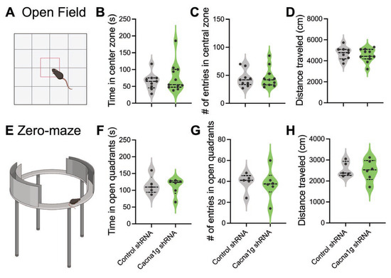 General activity and anxiety-related behaviors in Cacna1g shRNA-injected mice. (A) Graphic presentation of open-field test. (B) Time spent in the central zone of open-field arena. (C) Number of entries to central zone of open-field arena. (D) Distance traveled in open-field arena in control and Cacna1g shRNA mice. (E) Graphic presentation of zero-maze test. (F) Time spent in open quadrants. (G) Number of entries into open quadrants. (H) Distance traveled during zero-maze test in control and Cacna1g shRNA mice.