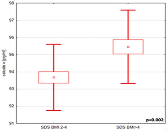 Comparison of the average salusin-α concentration in the group of children with BMI-SDS between 2 and 4 and >4 (p = 0.002).
