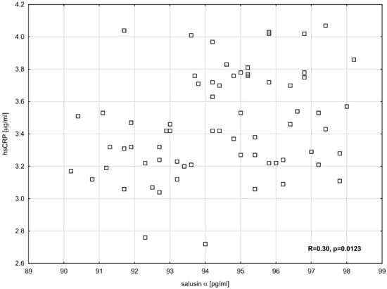 hsCRP correlation depending on salusin-α (Spearman’s correlation coefficient, R = 0.30, p = 0.0123).