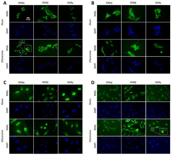 Zhang, Y.; Gailloud, L.; Shin, A.; Fewkes, J.; Pinckney, R.; Whiting, A.; Chazot, P. A Comparative Study of a Potent CNS-Permeable RARβ-Modulator, Ellorarxine, in Neurons, Glia and Microglia Cells In Vitro. Int. J. Mol. Sci. 2025, 26, 3551. https://doi.org/10.3390/ijms26083551
