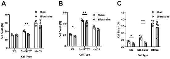 2.3. Ellorarxine Pretreatment Reduced Cell Death