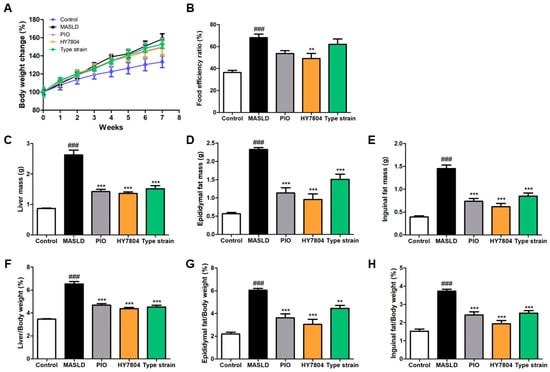 Effects of HY7804 on MASLD symptoms in MASLD-induced mice (n = 7 per group): (A) changes in body weight, (B) FER, (C) mass of liver tissues, (D) mass of epididymal fat, (E) mass of inguinal fat, (F) liver/body weight ratio, (G) epididymal fat/body weight ratio, and (H) inguinal fat/body weight ratio. The data are expressed as the mean ± SD. ### p < 0.001 vs. the control group, ** p < 0.01, and *** p < 0.001 vs. the MASLD group (one-way ANOVA with post hoc analysis). MASLD, mice fed an MASLD-inducing diet; PIO, pioglitazone + MASLD; HY7804, Lactobacillus helveticus HY7804 + MASLD; Type strain, Lactobacillus helveticus type strain KCTC 3545 + MASLD; FER, food efficiency ratio.
