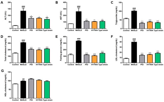 Concentration of biochemical indicators in mouse serum (n = 7 per group). (A) AST, (B) ALT, (C) triglycerides, (D) total cholesterol, (E) fasting glucose, (F) LDL-cholesterol, and (G) HDL-cholesterol. The data are expressed as the mean ± SD. ## p < 0.01 and ### p < 0.001 vs. the control group, * p < 0.05, ** p < 0.01, and *** p < 0.001 vs. the MASLD group (one-way ANOVA with post hoc analysis). MASLD, mice fed an MASLD-inducing diet; PIO, pioglitazone + MASLD; HY7804, Lactobacillus helveticus HY7804 + MASLD; Type strain, Lactobacillus helveticus type strain KCTC 3545 + MASLD; AST, aspartate aminotransferase; ALT, alanine aminotransferase; LDL-cholesterol, low-density lipoprotein cholesterol; HDL-cholesterol, high-density lipoprotein cholesterol.