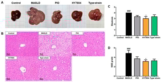 Effects of HY7804 on liver histology (n = 7 per group). (A) Liver tissue morphology. (B) Representative photomicrographs of hepatic histology (magnification ×100). (C) Steatosis score. (D) NAS. Data are expressed as the mean ± SD. ### p < 0.001 vs. the control group, * p < 0.05 vs. the MASLD group (one-way ANOVA with post hoc analysis). MASLD, mice fed an MASLD-inducing diet; PIO, pioglitazone + MASLD; HY7804, Lactobacillus helveticus HY7804 + MASLD; Type strain, Lactobacillus helveticus type strain KCTC 3545 + MASLD.