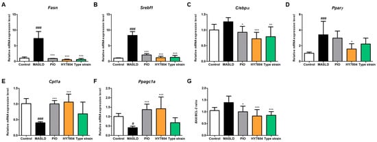 Next, we examined the expression of the lipid oxidation-related genes Cpt1a and Ppagc1a (PGC1a). The expression of Cpt1a and PGC1a mRNA showed similar patterns (Figure 4E,F); expression of both genes fell significantly in the MASLD group (Cpt1a, 0.40-fold, p < 0.001; PGC1a, 0.41-fold, p < 0.05), but was restored in the treatment groups. In particular, treatment with HY7804 increased mRNA expression to the greatest extent when compared with that in the MASLD group (Cpt1a, 1.06-fold; PGC1a, 1.42-fold, p < 0.001). By contrast, expression in the Type strain group was slightly higher than that in the MASLD group, but the difference was not significant.