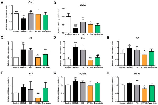 Effects of HY7804 on the expression of mRNAs in the colon of MASLD-induced mice (n = 7 per group). The expression of mRNA encoding tight junction proteins (A) Ocln and (B) Cldn1. The expression of mRNAs encoding pro-inflammatory cytokines and components of the TLR/MyD88/NF-Κb pathway. (C) Il6, (D) Il1β, (E) Tnfα, (F) Tlr4, (G) MyD88, and (H) Nfκb1. Data are expressed as the mean ± SD. # p < 0.05, ## p < 0.01, and ### p < 0.001 vs. the control group; * p < 0.05, ** p < 0.01, and *** p < 0.001 vs. the MASLD group (one-way ANOVA with post hoc analysis). MASLD, mice fed an MASLD-inducing diet; PIO, pioglitazone + MASLD; HY7804, Lactobacillus helveticus HY7804 + MASLD; Type strain, Lactobacillus helveticus type strain KCTC 3545 + MASLD.