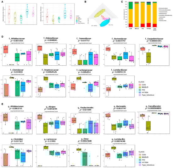 Composition of the gut microbiota in the MASLD-induced mice (n = 7 per group). (A) α-diversity. (B) PCoA of β-diversity using a 3D plot. (C) Relative abundance at the phylum level. (D) Relative abundance at the family level. (E) Relative abundance at genus level. Black dots indicate the values of each samples. Yellow diamonds indicate the mean. Black lines indicate the median. In the graph, red represents CON, yellow represents MASLD, green represents PIO, blue represents HY7804, and purple represents Type_helveticus group. CON, control group mice; MASLD, mice fed an MASLD-inducing diet; PIO, pioglitazone + MASLD; HY7804, Lactobacillus helveticus HY7804 + MASLD; Type_helveticus, Lactobacillus helveticus type strain KCTC 3545 + MASLD.