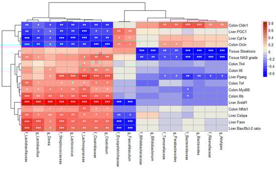 Correlation (Pearson’s correlation coefficient) between the intestinal microbial flora and biochemical indicators. Red indicates a positive Pearson r value and blue indicates a negative Pearson r value. The number indicates the r value. p-value < 0.05 was considered statistically significant. (* p < 0.05, ** p < 0.01, and *** p < 0.001).