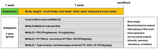 Male C57BL/6 mice (6 weeks old) were obtained from Dooyeol Biotech (Seoul, Republic of Korea) and maintained in cages at 45~65% humidity and a temperature of 21–23 °C under a 12:12 h light/dark cycle. After 7 days of adaptation, the mice were divided randomly to five experimental groups: control (AIN-93G diet, n = 7); MASLD-induced diet (MASLD, D09100310, n = 7); MASLD diet with pioglitazone (PIO, n = 7); MASLD diet with Lactobacillus helveticus HY7804 (HY7804, n = 7); and MASLD diet with type strain Lactobacillus helveticus KCTC 3545 (Type strain, n = 7). PIO and probiotics were dissolved in 100 μL of saline and administrated orally at a dose of 10 mg/kg/day [] and 109 CFU/kg/day [], respectively, for 7 weeks. The animal study was continued for 7 weeks, during which time food/water intake and body weight were measured weekly. The mice were sacrificed, and blood, liver, epididymal fat, inguinal fat, colon, and cecum tissues were collected. The weight of the liver and fat tissue was measured immediately after extraction. The protocol for the animal experiments protocol was approved by the Institutional Animal Care and Use Committee, hy Co., Ltd., Republic of Korea (IACUC approval number: AEC-2024-0001-Y). In Figure 8 shows the flow chart of the animal tests.