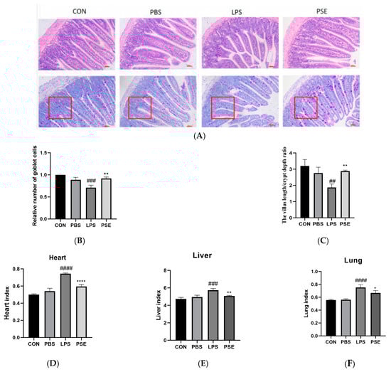 2.1.2. Effects of PSE on Organ Index and Jejunal Histopathology in LPS-Induced Colitis Mice