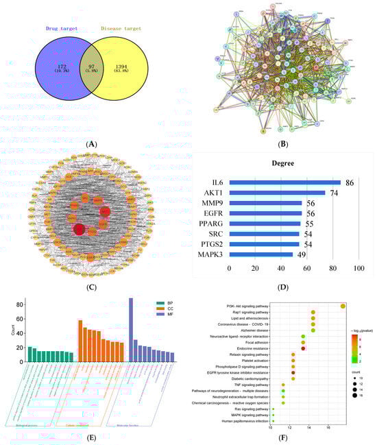 - Zhang, Y.; Wang, Y.; Xin, E.; Zhang, Z.; Ma, D.; Liu, T.; Gao, F.; Bian, T.; Sun, Y.; Wang, M.; et al. Network pharmacology and experimental verification reveal the mechanism of hedysari radix and curcumae rhizoma with the optimal compatibility ratio against colitis-associated colorectal cancer. J. Ethnopharmacol. 2024, 322, 117555. [Google Scholar] [CrossRef]