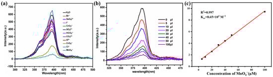 - Abdollahi, N.; Morsali, A. Highly sensitive fluorescent metal-organic framework as a selective sensor of MnVII and CrVI anions (MnO4−/Cr2O72−/CrO42−) in aqueous solutions. Anal. Chim. Acta 2019, 1064, 119–125. [Google Scholar] [CrossRef]