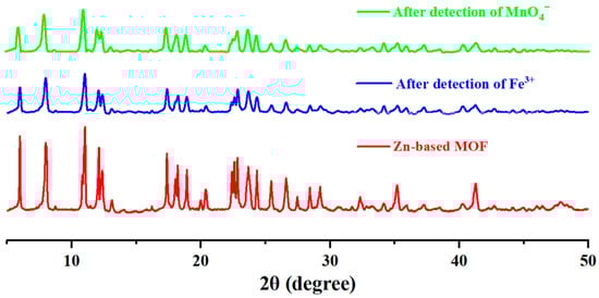 - Xu, Z.; Su, M.; He, X.; Zhang, B.; Wang, Y.; Li, H. A porous luminescent Zn-MOF for selective probing Fe3+ and nitrophenolic compounds. Inorg. Chem. Commun. 2020, 111, 107644. [Google Scholar] [CrossRef]