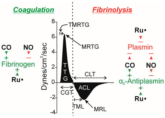 Possible effects of CO, NO, and Ru• on key molecules in the coagulation and fibrinolytic pathways, with relevant thrombelastographic variables. The center portion of the figure displays thrombelastographic output over time during thrombus growth during coagulation followed by data during fibrinolysis, separated with the vertical, dashed line. ACL = area of clot lysis (dynes/cm2); CGT = clot growth time (minutes); CLT = clot lysis time (minutes); MRTG = maximum rate of thrombus growth (dynes/cm2/second); MRL = maximum rate of clot lysis (dynes/cm2/second); TML = time to maximum lysis (minutes), also reported as TMRL, time to maximum rate of lysis—this is the time from maximum clot strength to time of maximum rate of lysis; TMRTG = time to MRTG (minutes); and, TTG = total thrombus generation (dynes/cm2). The key molecules involved in the process of coagulation (fibrinogen, green indicating enhancing coagulation) and fibrinolysis (α2-antiplasmin, green as it diminishes fibrinolysis; plasmin, red as it enhances fibrinolysis) are depicted within the left and right sides of the dashed line. Green arrowheads with (+) indicate the enhancement of fibrinogen as a substrate or α2-antiplasmin enzymatic activity by the indicated molecule; red arrowheads and (−) indicate the degradation of fibrinogen as a substrate or α2-antiplasmin or plasmin enzymatic activity. Please refer to the text for the literature supporting these possible molecular interactions.
