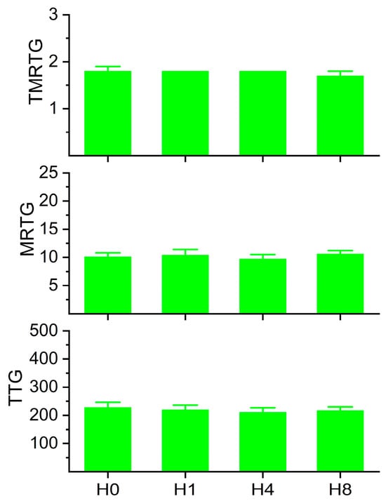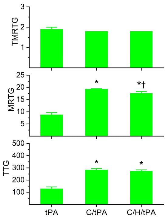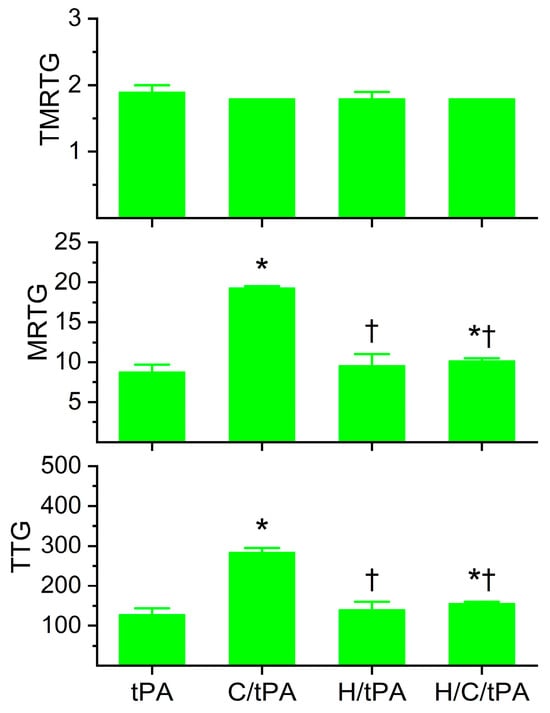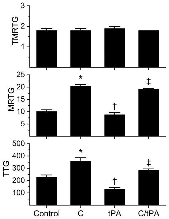 The analyses of the coagulation kinetic data are as follows. As noted previously in [,,,], neither the addition of CORM-2 nor tPA significantly affected TMRTG. In sharp contrast, the MRTG and TTG values of all four conditions were significantly different from each other. The addition of CORM-2 increased MRTG (102%) and TTG (58%) values compared to the control condition; further, the addition of tPA decreased MRTG (13%) and TTG (43%) compared to the control condition. Compared to the CORM-2 addition condition, the addition of tPA to CORM-2 exposed samples resulted in a decrease in MRTG (5%) and TTG (21%). The enhancement of coagulation kinetic values by CORM-2 and degradation by tPA was consistent with previous works utilizing 100 µM CORM-2 with or without 100 U/mL tPA [,,,,,].