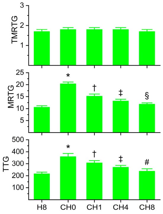 Coagulation kinetic data of plasma exposed to histidine for 5 min before exposure to CORM-2 for 5 min. H8 = exposure to 8 mM histidine; CH0 = no exposure to histidine, exposure to 100 µM CORM-2; CH1 = exposure to 1 mM histidine followed by CORM-2 exposure; CH4 = exposure to 4 mM histidine followed by CORM-2 exposure; CH8 = exposure to 8 mM histidine followed by CORM-2 exposure; and N = 6 per condition; data analyzed with one-way ANOVA with Holm–Sidak post hoc test. * p < 0.05 vs. H8; † p < 0.05 vs. H8 and CH0; ‡ p < 0.05 vs. H8, CH0, and CH1; § p < 0.05 vs. H8, CH0, CH1, and CH4; # p < 0.05 vs. CH0, CH1, and CH4.