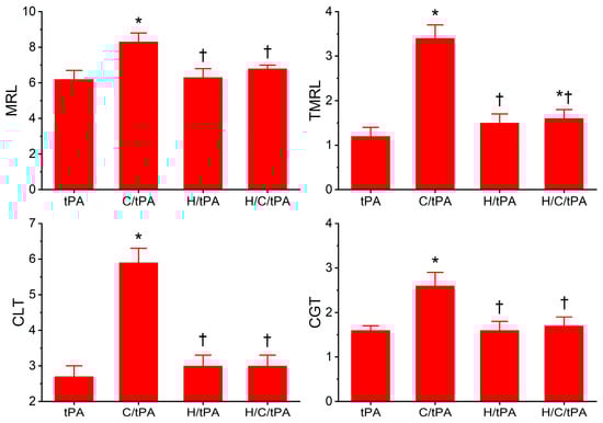 Plasmatic coagulation kinetic data in the presence of tPA, CORM-2, and histidine. tPA = condition with only 500 U/mL tPA added; C/tPA = condition with 100 µM CORM-2 and tPA added; H/tPA = histidine 8 mM and tPA added; H/C/tPA = condition with first histidine added before CORM-2 is added, and tPA. N = 6 per condition; data analyzed with one-way ANOVA with Holm–Sidak post hoc test. * p < 0.05 vs. tPA; † p < 0.05 vs. C/tPA.