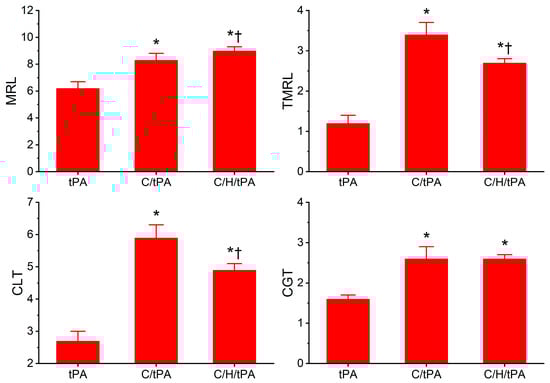 Determination of the reversibility of CORM-2-mediated effects on plasmatic coagulation kinetics following the addition of histidine after CORM-2 addition in the presence of tPA. tPA = condition with only 500 U/mL tPA added; C/tPA = condition with 100 µM CORM-2 and tPA added; C/H/tPA = condition with first CORM-2 added before histidine is added, and tPA. N = 6 per condition; data analyzed with one-way ANOVA with Holm–Sidak post hoc test. * p < 0.05 vs. tPA; † p < 0.05 vs. C/tPA.