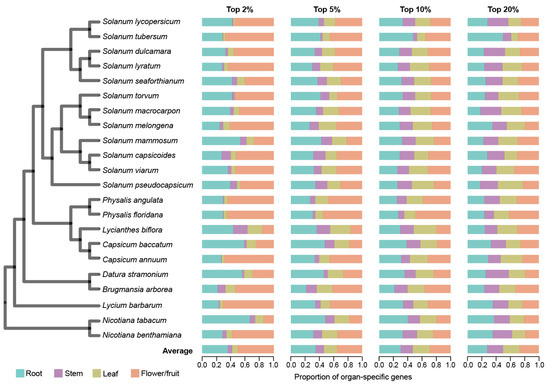 Characterization of organ-specific gene expression in each of the 22 Solanaceae species. The phylogenetic tree on the left illustrates the evolutionary relationships among 22 Solanaceae species. Organ-specific gene expression was assessed using four thresholds based on SPM value, with the top 2%, 5%, 10%, and 20% of genes ranked from highest to lowest SPM values selected for analysis. The bar chart displays the relative proportion of organ-specific genes across four organ types (root, stem, leaf, flower/fruit), showing the distribution of organ-specific genes as a percentage of the total number of organ-specific genes identified.