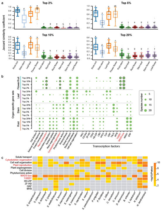 Comparison of organ-specific gene expression across 22 Solanaceae species. (a) Boxplot illustrating the Jaccard similarity coefficient (JSC) for organ-specific gene sets. The y-axis represents JSC values, while the x-axis compares the same organ (e.g., root–root) and one organ against others (e.g., root–stem). Higher JSC values indicate greater similarity between the transcriptomes. Statistical significance of differences (two-sided Mann-Whitney U test) is indicated by lettered annotations (p < 0.05). (b) Bubble plot depicting the number of species with significant functional enrichment (p < 0.05) for specific pathways and transcription factors. The vertical axis lists the 16 gene sets used for enrichment analysis, while the size of each bubble represents the number of species (out of 22) enriched for that particular pathway or transcription factor. (c) Heatmap visualization of enrichment results for the top 10% flower/fruit-specific genes across 22 Solanaceae species.