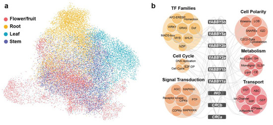Gene clusters in the co-expression network built for tomato. (a) Overview of the co-expression network for tomato, with genes specifically expressed in different organs highlighted by distinct colors. The network was visualized using the “preferred layout” in Cytoscape v3.7.2. (b) Co-expressed gene families of the YABBY genes. The six colored bubbles represent six functionally classified gene families. Abbreviations for some gene families include DNA replication (core DNA replication machinery), cell cycle (core cell cycle genes), GH (glycoside hydrolase), SLSP (subtilisin-like serine proteases), monolignol (monolignol biosynthesis), CE (carbohydrate esterase), lipid (lipid metabolism), OST (organic solute cotransporters), and GST (glutathione S-transferase).