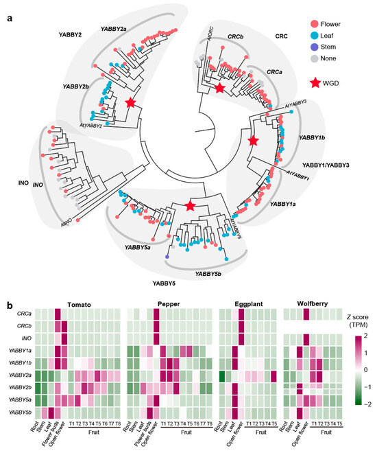 Although YABBY genes have been well-characterized in tomato flower and fruit development, their broader roles across the Solanaceae family remain largely unexplored [68,71,72,73]. Here, we identified 193 YABBY genes across 22 Solanaceae species (Table S10). Using the 5 known YABBY genes from Arabidopsis and 9 YABBY genes present in tomato as a reference, we subdivided the 193 genes into nine distinct subfamilies: CRCa (20 genes), CRCb (21 genes), INO (22 genes), YABBY1a (24 genes), YABBY1b (21 genes), YABBY2a (28 genes), YABBY2b (15 genes), YABBY5a (22 genes), and YABBY5b (20 genes). These subfamilies primarily arose from whole-genome duplications, with paralogous relationships between CRCa and CRCb, YABBY1a and YABBY1b, YABBY2a and YABBY2b, and YABBY5a and YABBY5b (Figure 5a). Expression analysis revealed 167 out of 193 YABBY genes showed specificity in flower/fruit and leaf organs.