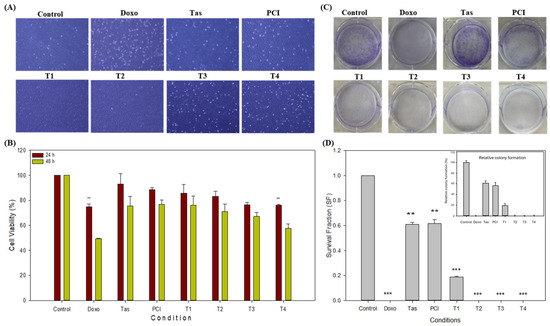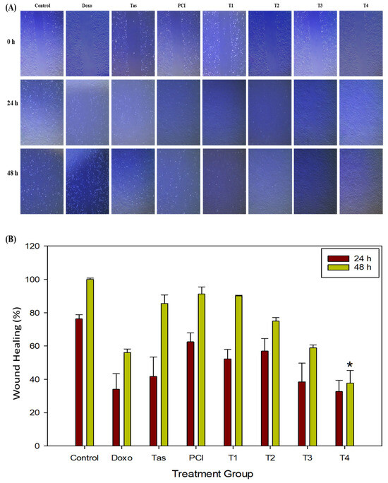 To evaluate the effects of doxo, Tas, and PCI on the migratory capacity of osteosarcoma cells, we conducted wound healing assays under various treatment conditions. Our findings showed that the T4 treatment group exhibited a modest reduction in wound closure compared to the doxo-treated group (Figure 3A,B). Specifically, after 24 h of treatment, the wound healing rate in the doxo-treated group was 34.01%, whereas the T4 treatment group exhibited a slightly lower rate of 32.73% (* p < 0.05). By 48 h, the wound closure rate in the doxo group increased substantially to 56.15%, whereas the T4 treatment group showed only a modest improvement, reaching 37.74%. These findings suggest that combination therapy (T4) effectively impaired the migratory ability of osteosarcoma cells. Additionally, while combination therapy (T4) appears to reduce osteosarcoma cell migration, the effect is modest and not clearly superior to that of doxo monotherapy.