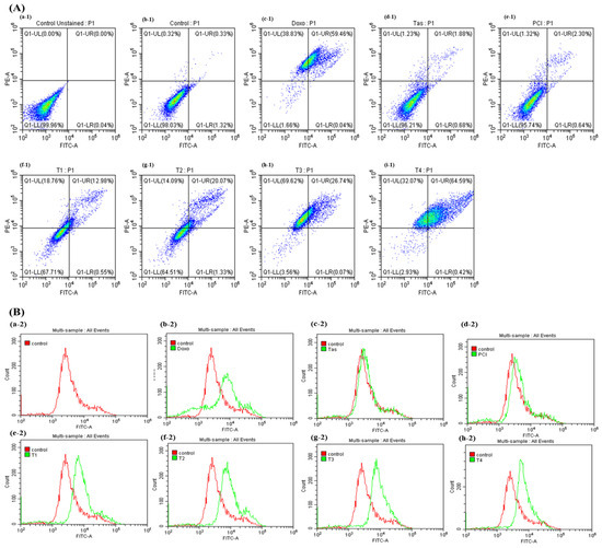 Apoptosis in osteosarcoma cells was analyzed by flow cytometry using the Annexin-V FITC and PI staining kit (Abcam ab14085). SJSA-1 osteosarcoma cells were seeded in 60 mm culture plates and incubated until they reached 70.0–80.0% confluence. The medium was then replaced with the drug treatment medium. After 48 h of incubation, cells were washed with cold PBS, harvested using 0.25X trypsin (SolBio; Gyeonggido, Republic of Korea), and cell viability was assessed. The cells were subsequently suspended in 500.0 µL of binding buffer (R&D Systems; Minneapolis, MN, USA) and incubated in the dark with 5.0 µL of annexin V-FITC and 5.0 µL of propidium iodide, following the manufacturer’s instructions (Abcam). Flow cytometric analysis was performed using a Beckman Coulter CytoFlex flow cytometer (Beckman Coulter Inc., Suzhou, China) with detection filters set at 530/30 (annexin-V FITC) and 610/20 (PI), using an excitation laser at 488 nm.