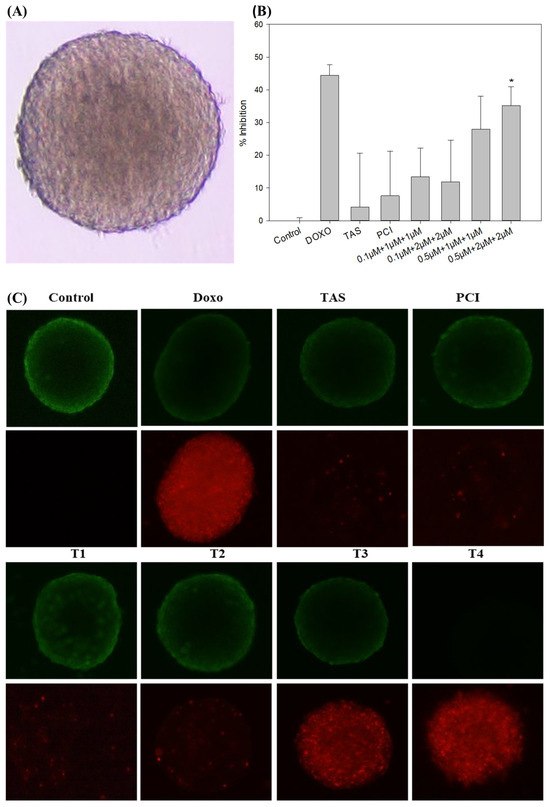 Following spheroid formation, drug treatments were administered for 48 h under conditions comparable to those in the 2D monolayer model. Quantitative analysis of spheroid size using ImageJ software version 1.54g (Java version: 1.8.0_345, NIH, Bethesda, MD, USA) demonstrated a dose-dependent reduction in spheroid dimensions following drug exposure. Monotherapy with Tas (4.19%) and PCI (7.58%) had minimal impact on spheroid size. In contrast, combination treatments exhibited significant cytotoxic effects, with doxo reducing spheroid size by 44.40% and the T4 combination by 35.19% (Figure 4B). The response observed in the doxo-treated group was comparable to that of the T4 combination group, suggesting an enhanced therapeutic effect through co-administration.