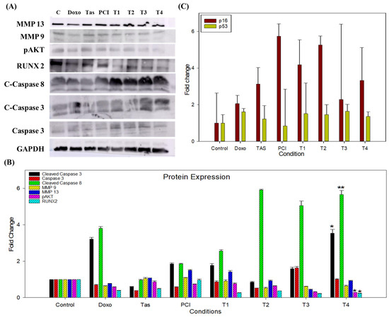 To investigate the molecular mechanisms contributing to the anti-tumor effects of the combination therapy, we conducted a Western blot analysis to assess the expression levels of key oncogenic, metastatic, and apoptotic markers in SJSA-1 3D spheroids following various treatments. The observed reduction in osteosarcoma cell migration (Figure 3A,B) was corroborated by the molecular analysis of ECM-degrading enzymes, particularly MMP9 and MMP13. MMPs play a critical role in tumor cell invasion and metastasis by facilitating ECM remodeling and degradation. The Western blot analysis demonstrated a marked downregulation of MMP9 and MMP13 protein levels in the doxo and T4 treatment groups compared to the control. In addition, MMP9 expression was downregulated in the T1, T2, and T3 combination groups. Suppression of these MMPs further supports the hypothesis that combination therapy impedes osteosarcoma cell migration by inhibiting ECM degradation, thereby potentially limiting metastatic dissemination.