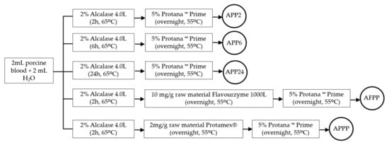 First, 2% Alcalase 4.0 L was added to all hydrolysates and incubated at 65 °C at different times: 2 h (APP2, AFPP, APPP), 6 h (APP6), or 24 h (APP24). Next, different enzymes were applied as follows: 5% Protana™ Prime (APP2, APP6, APP24), 10 mg/g raw material Flavourzyme 1000 L (AFPP), and 2 mg/g raw material Protamex® (APPP) were used for an overnight treatment at 55 °C. Finally, a second addition of 5% Protana™ Prime was applied overnight at 55 °C to the AFPP and APPP hydrolysates. The percentage of the added enzymes was determined as recommended by the manufacturer. Finally, the hydrolysates were heated in a water bath (85 °C, 15 min) for enzyme inactivation. All the hydrolysates were performed in triplicate and stored at −20 °C.