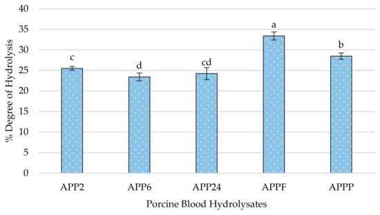 Degree of hydrolysis calculated in the porcine blood hydrolysates. Values were obtained via the mean of three replicates. Bars with different letters show significant differences between samples (p < 0.05).